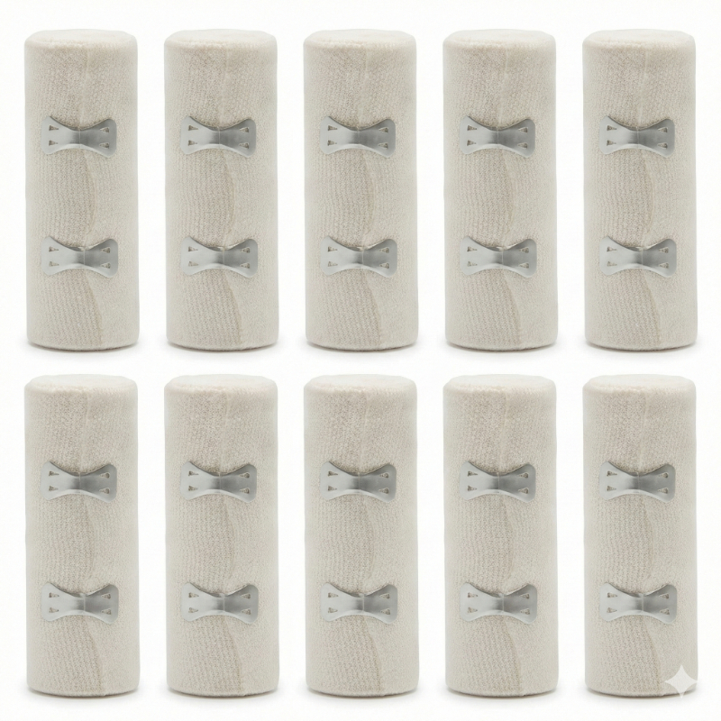 תחבושת אלסטית איכותית ברוחב 8 ס"מ, המיועדת לחבישת לחץ מתונה, טיפול בנקעים וקיבוע שרירים ומפרקים. התחבושת עשויה אריג גמיש ונושם המאפשר מתיחה אופטימלית והתאמה מושלמת למבנה הגוף. כל גליל מגיע עם זוג תופסני מתכת (סיכות "פרפר") המבטיחים סגירה יציבה ומניעת תזוזה של החבישה. המארז כולל 10 יחידות ומתאים במיוחד לחידוש מלאי בערכות עזרה ראשונה, מוסדות ושימוש ביתי רב-פעמי.